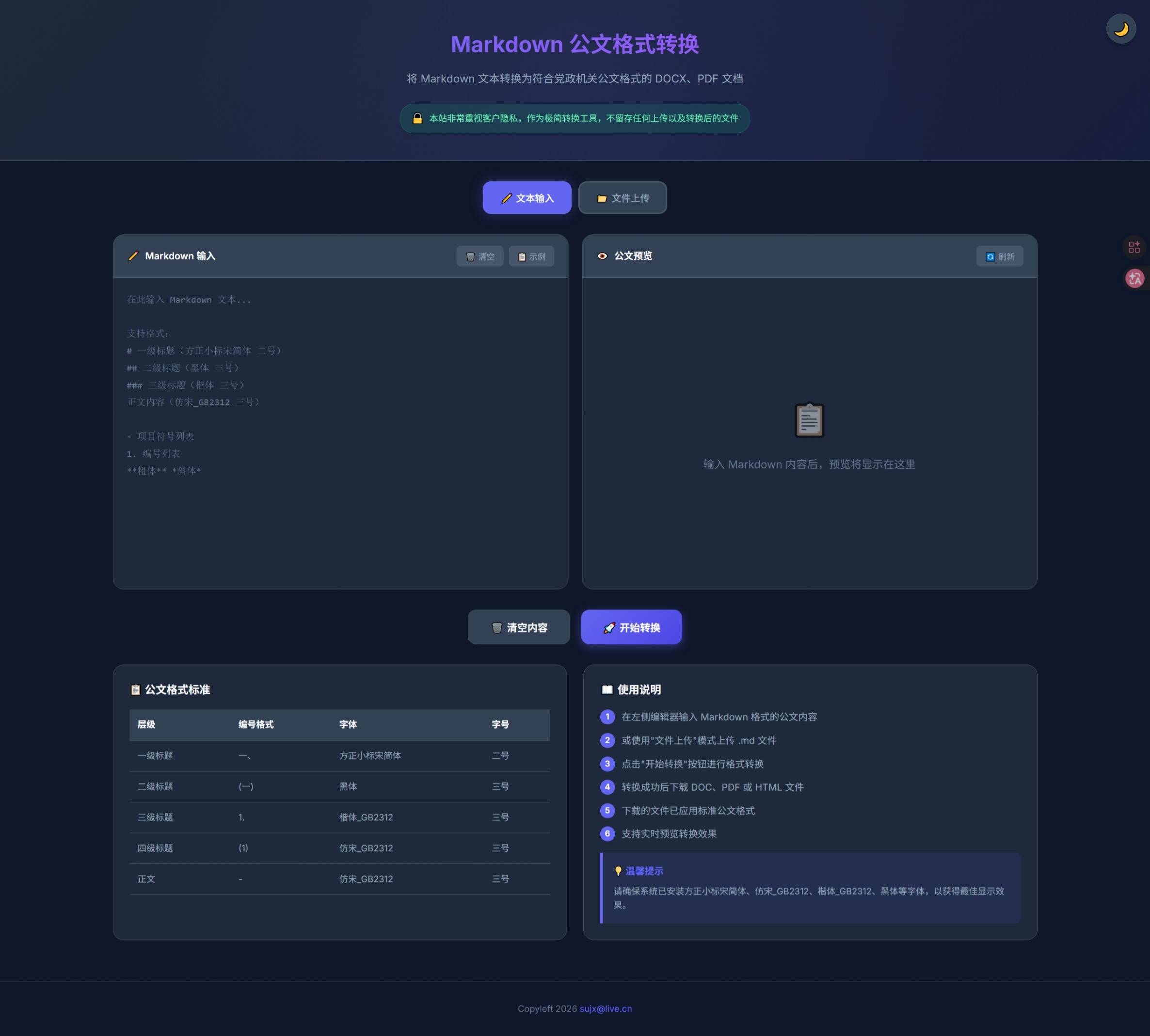 .md文件 - 隐私保护:文件生成并下载后自动从服务器删除,不留存任何用户文档